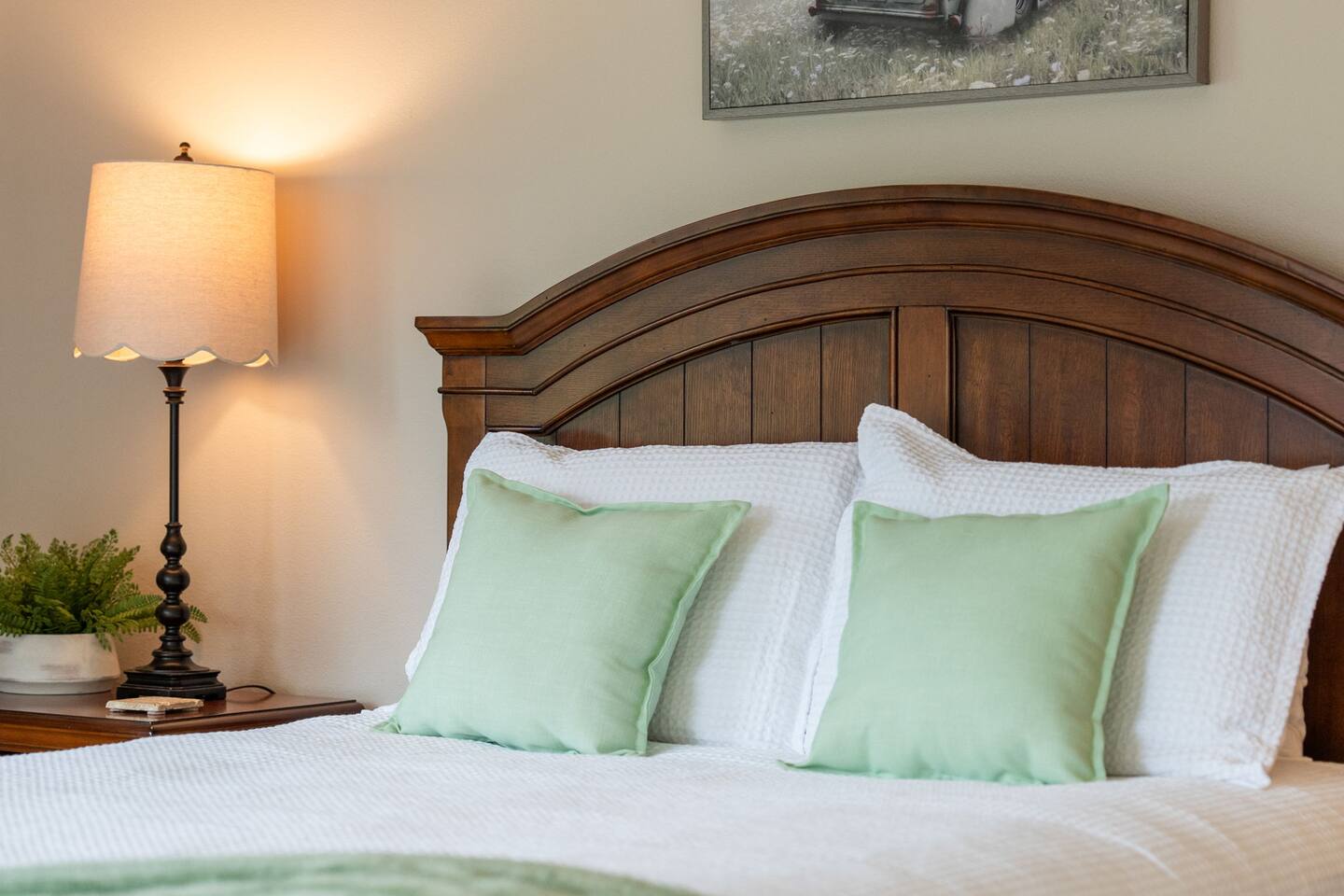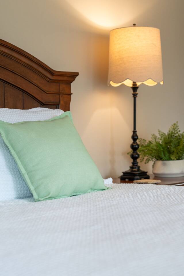 - Bedroom 1: King bed with private ensuite bathroom (walk in shower) on second floor with private deck and TV (Roku for local channels and apps). All linens for bed and bath are provided.
