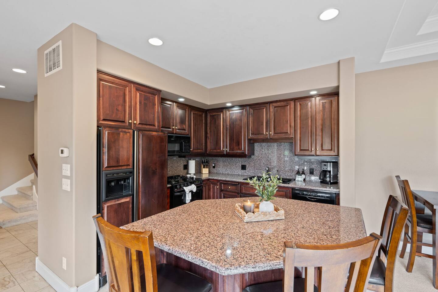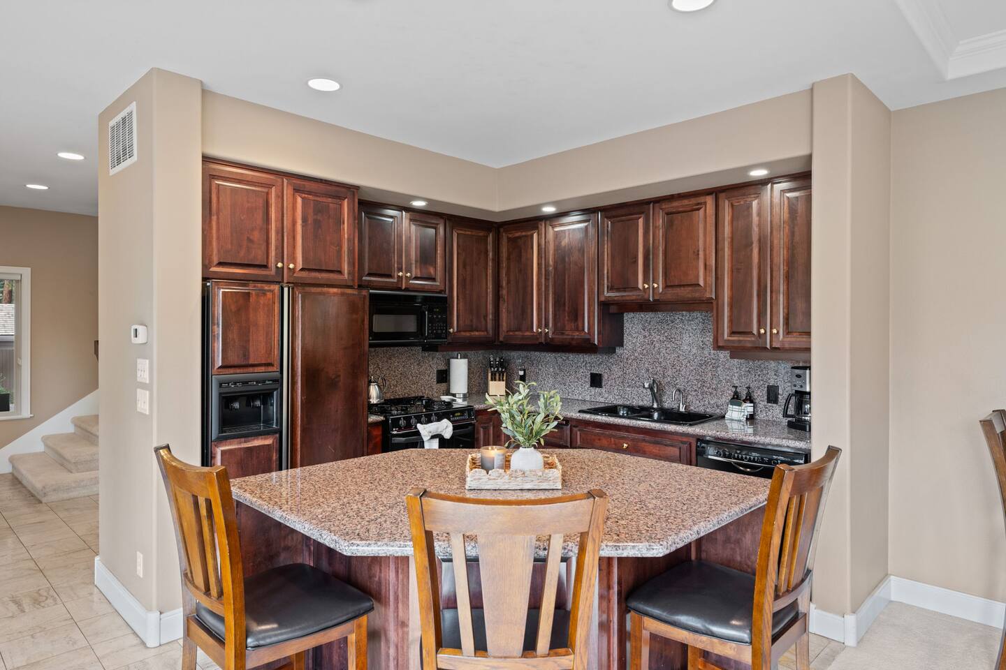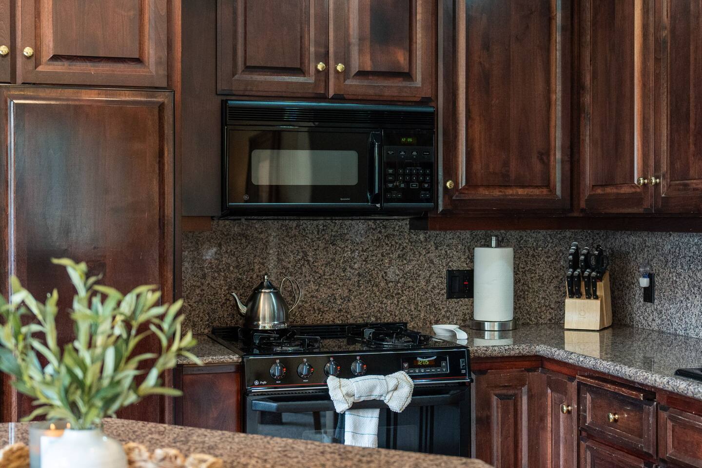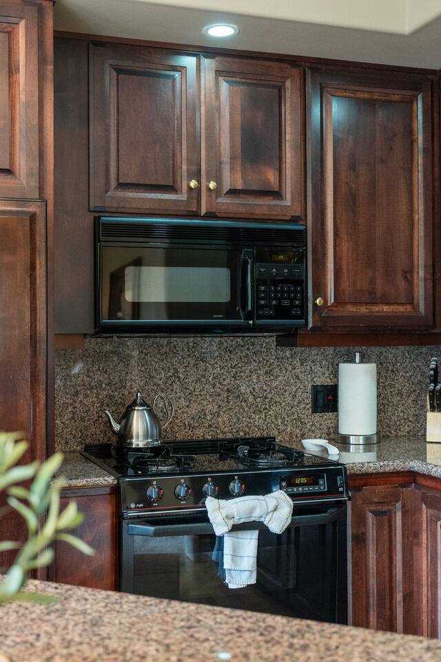 - Fully stocked kitchen with serveware, cutlery, small appliances, range, dishwasher, microwave, and large refrigerator. Helpful items like salt & pepper, oil, and coffee are stocked at the home.