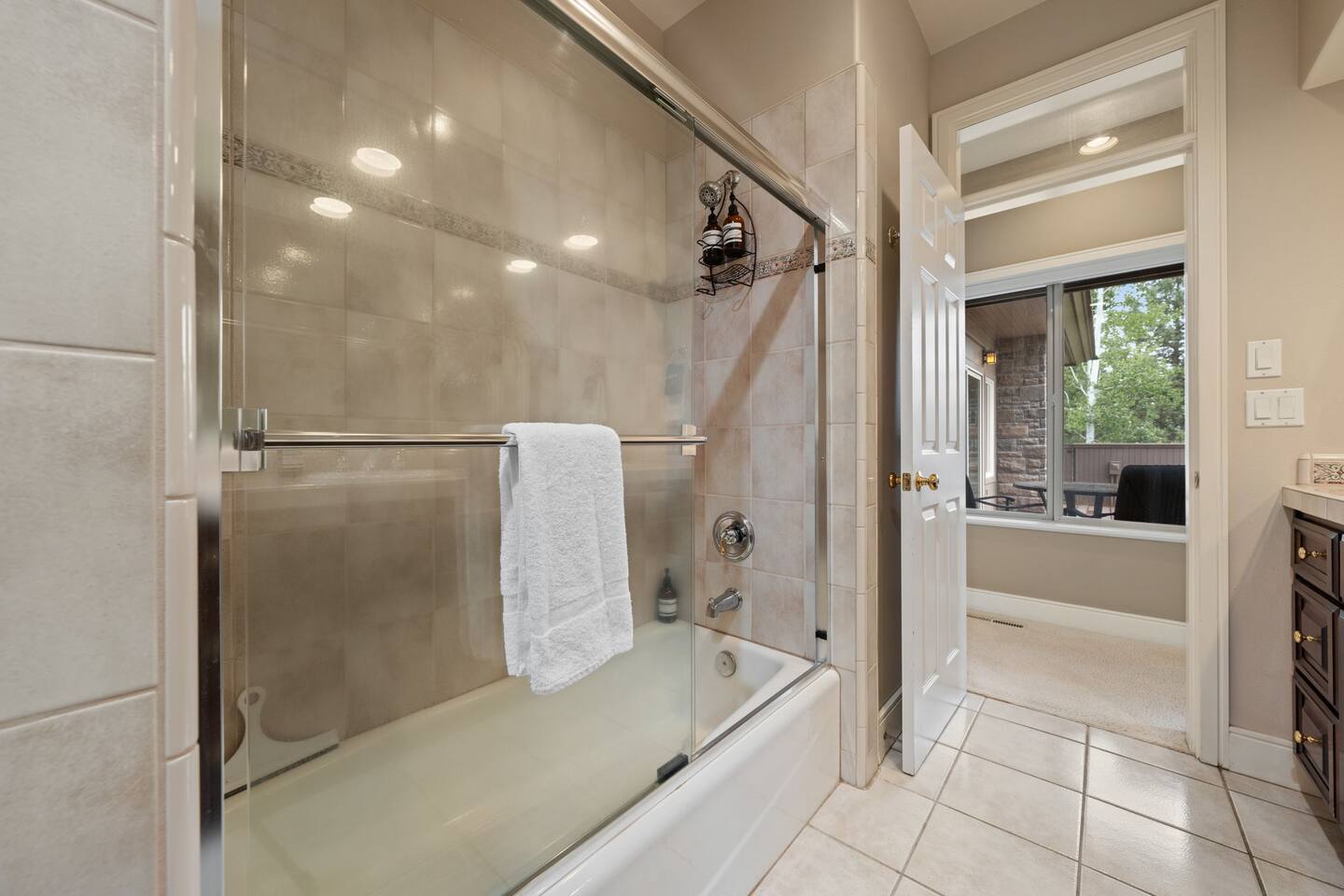- Bedroom 2: Queen bed with large ensuite bathroom (tub/shower) on first floor with access to main deck. All linens for bed and bath are provided.