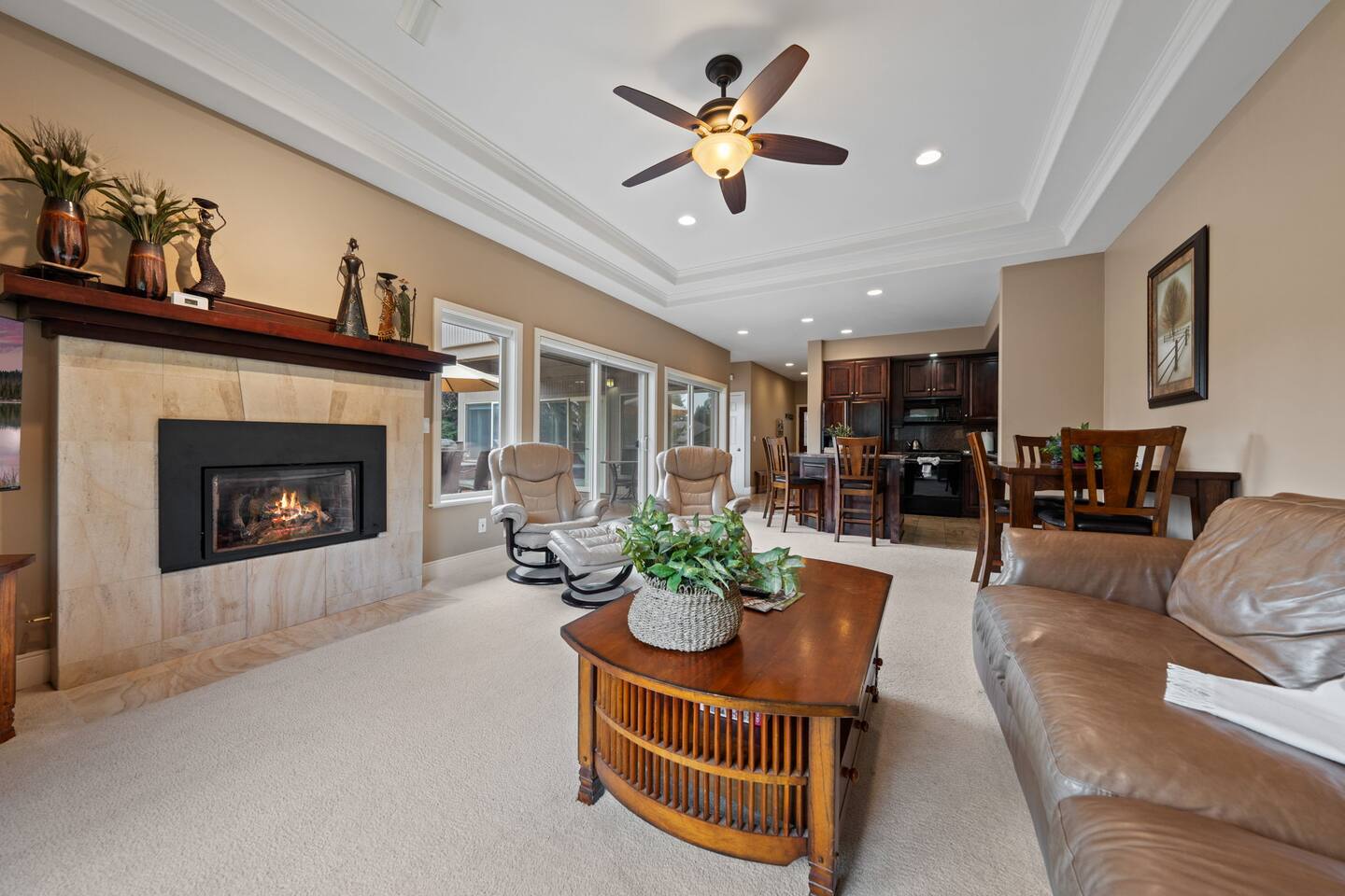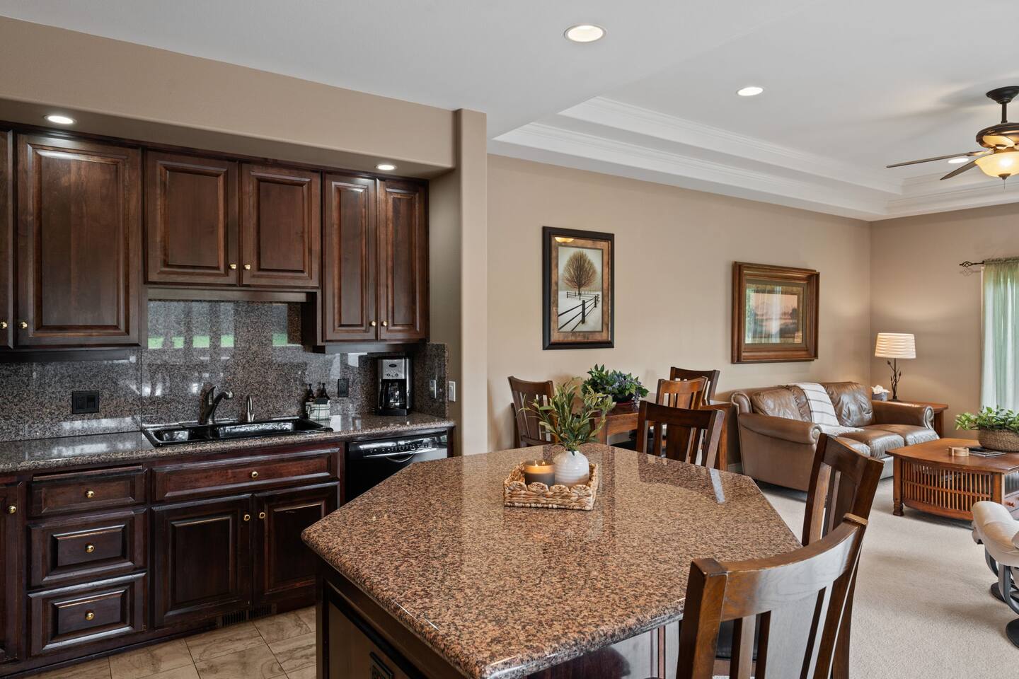 - Large open-concept living room with comfortable seating for 5 with Roku TV to be able to watch live TV and log in to your apps like Netflix or Hulu.
