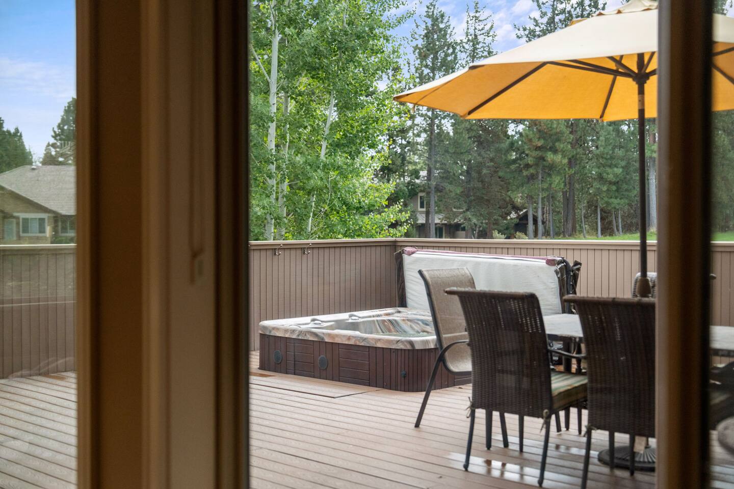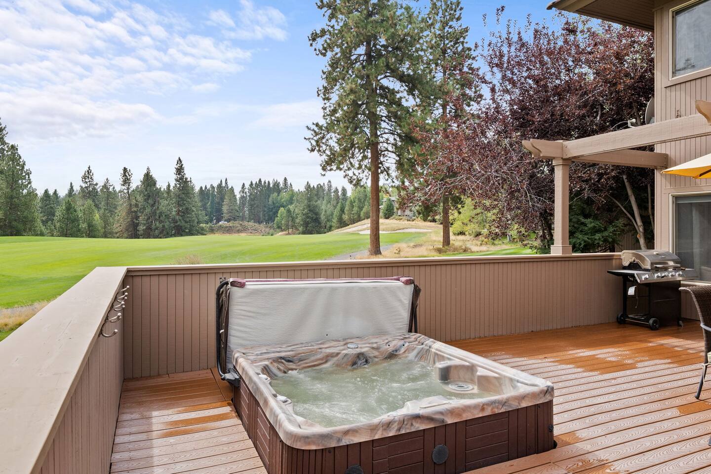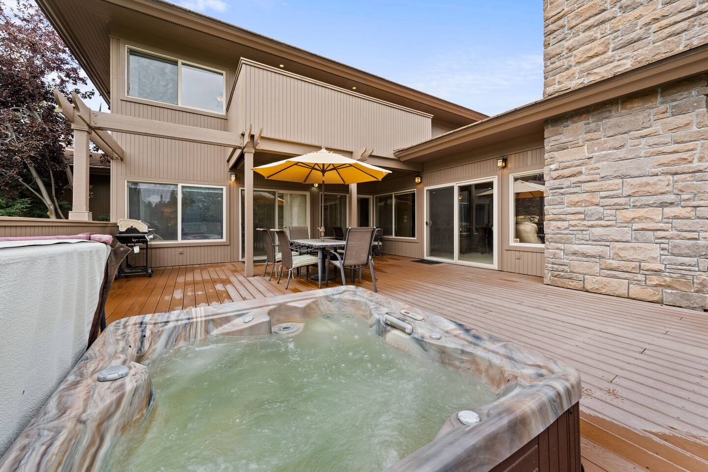 - Large deck space with a professionally cleaned and maintained hot tub that seats up to 4, multiple seating options for 6+ guests, and a BBQ (propane provided) to make evenings on the patio magical