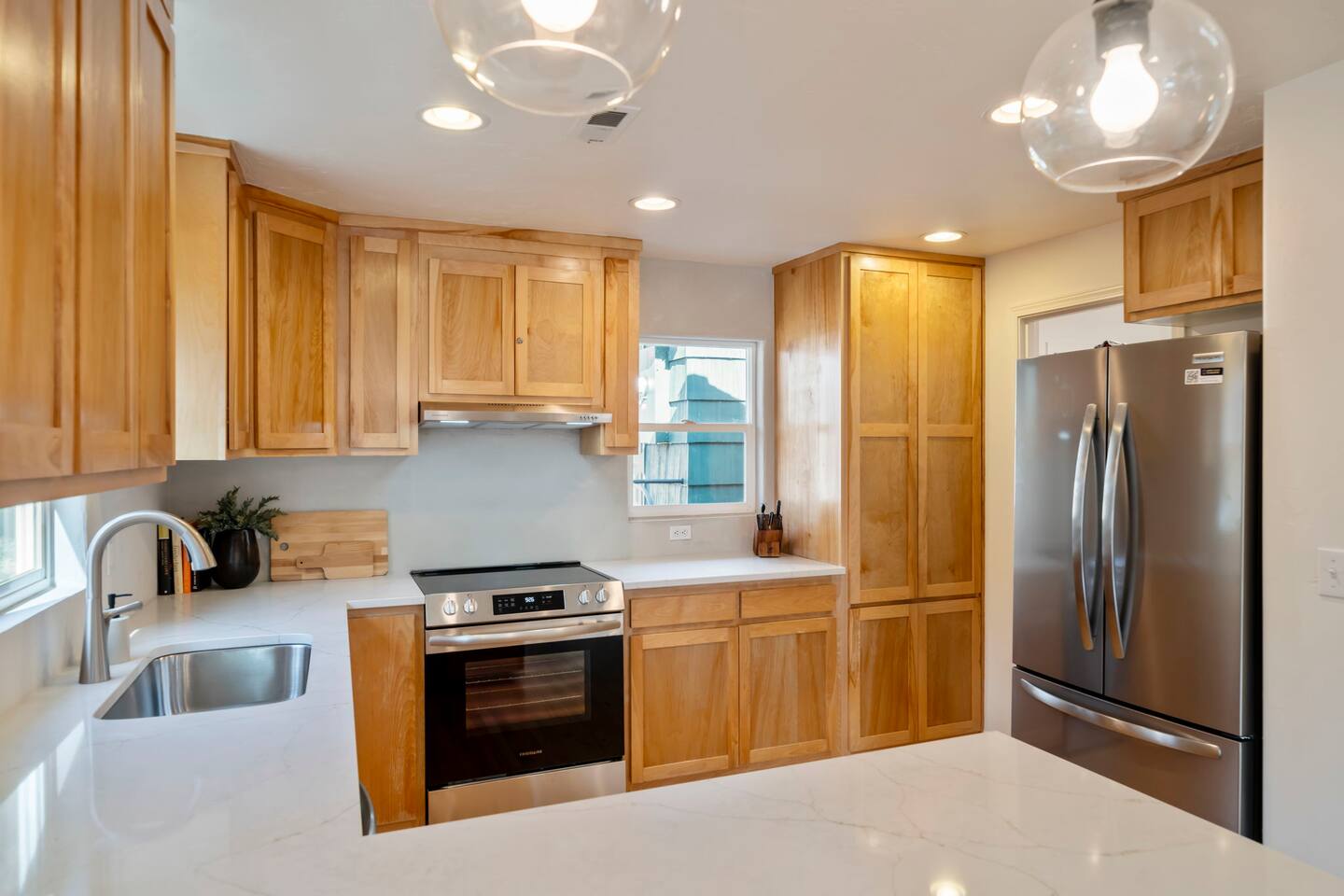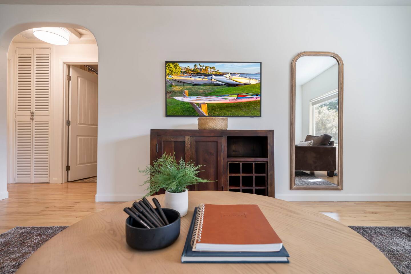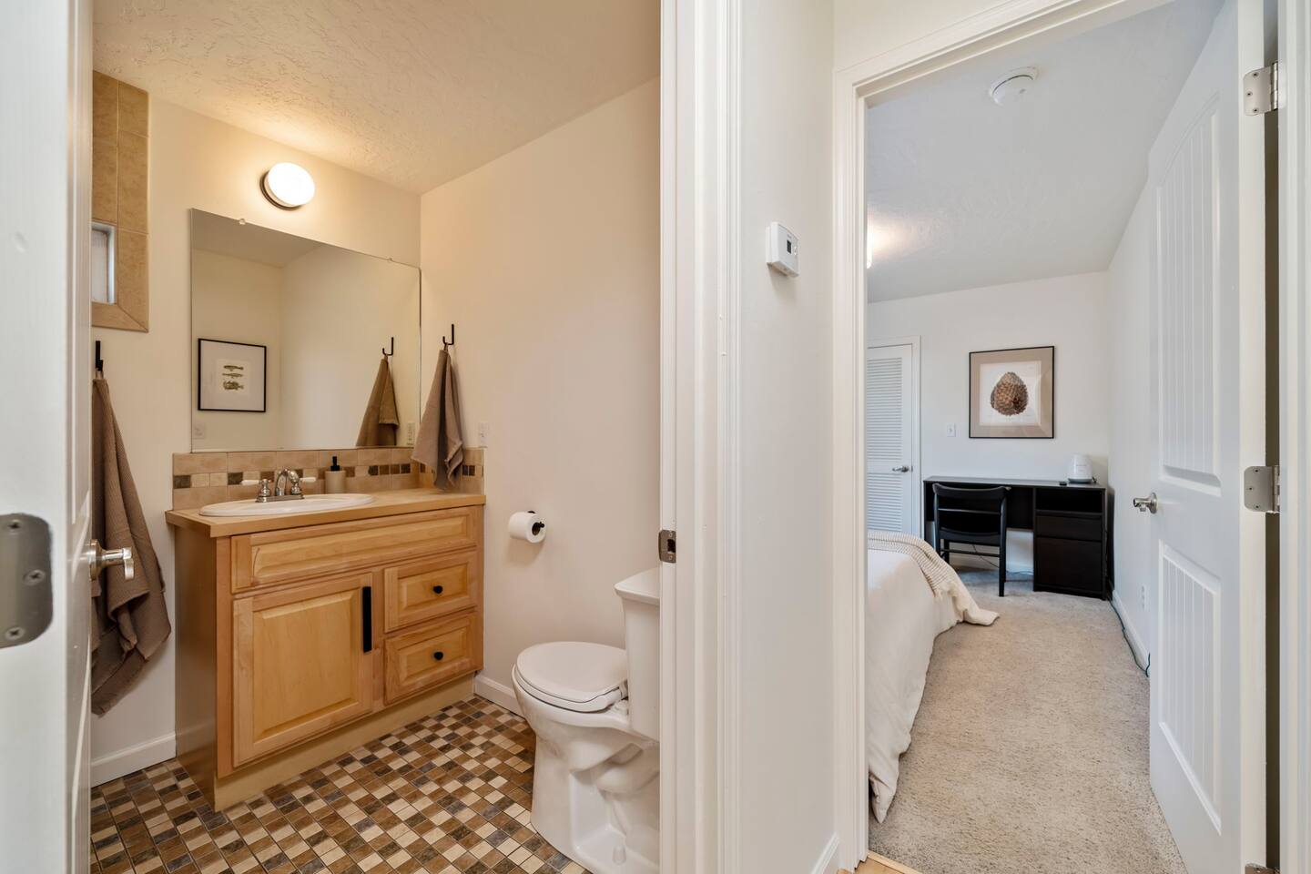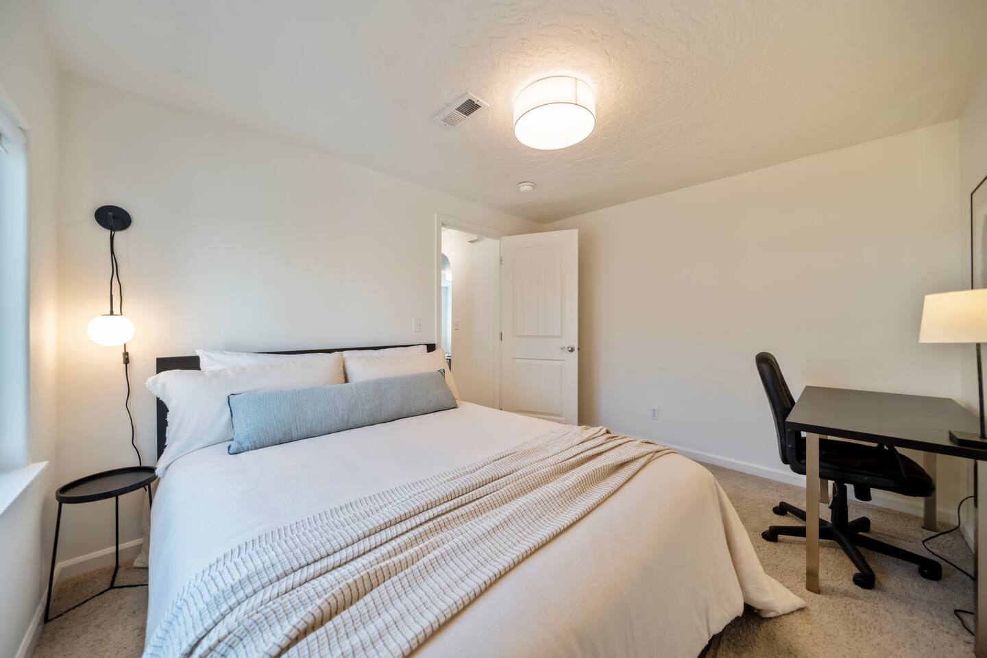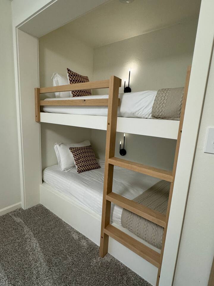 The home welcomes you with a spacious open-concept layout. The living room, dining room, and kitchen all open to easily create a feeling of living large and plenty of space to entertain. The living room has a smart TV with streaming apps and cable channels. The dining table fits 6 and is open to the fully-stocked kitchen. Off of the living room, there are two bedrooms. The front bedroom has a queen bed and a built in bunk bed with two twin beds. The second bedroom has one queen bed and office desk and chair. In between these bedrooms is a full bathroom with a tub/shower combo. We provide fresh linens and soaps for our guests along with a hair dryer.