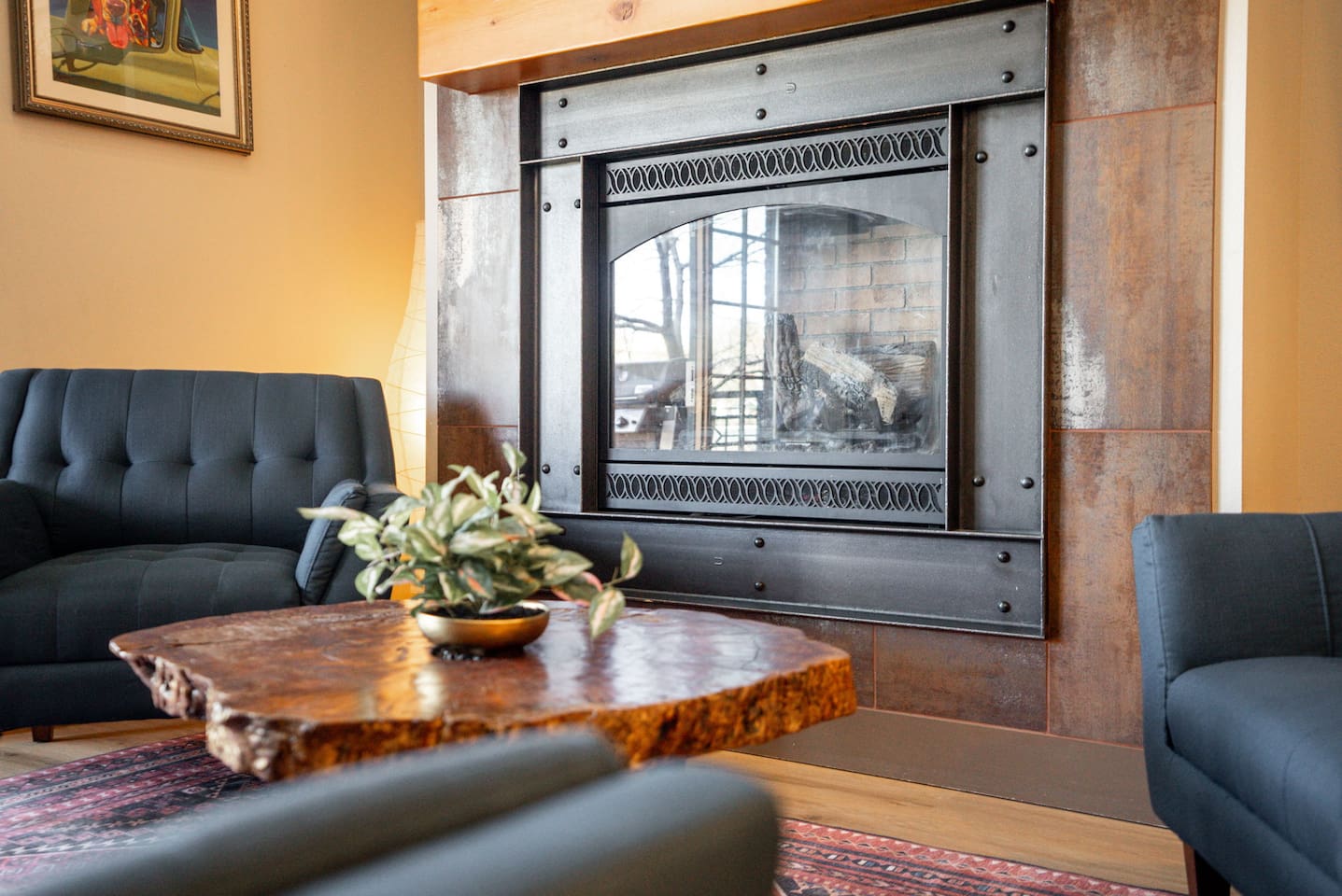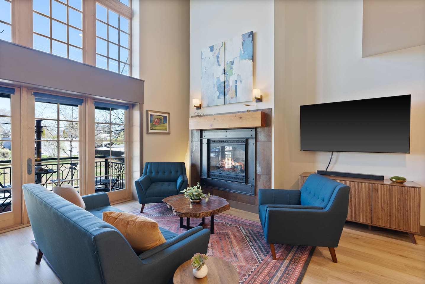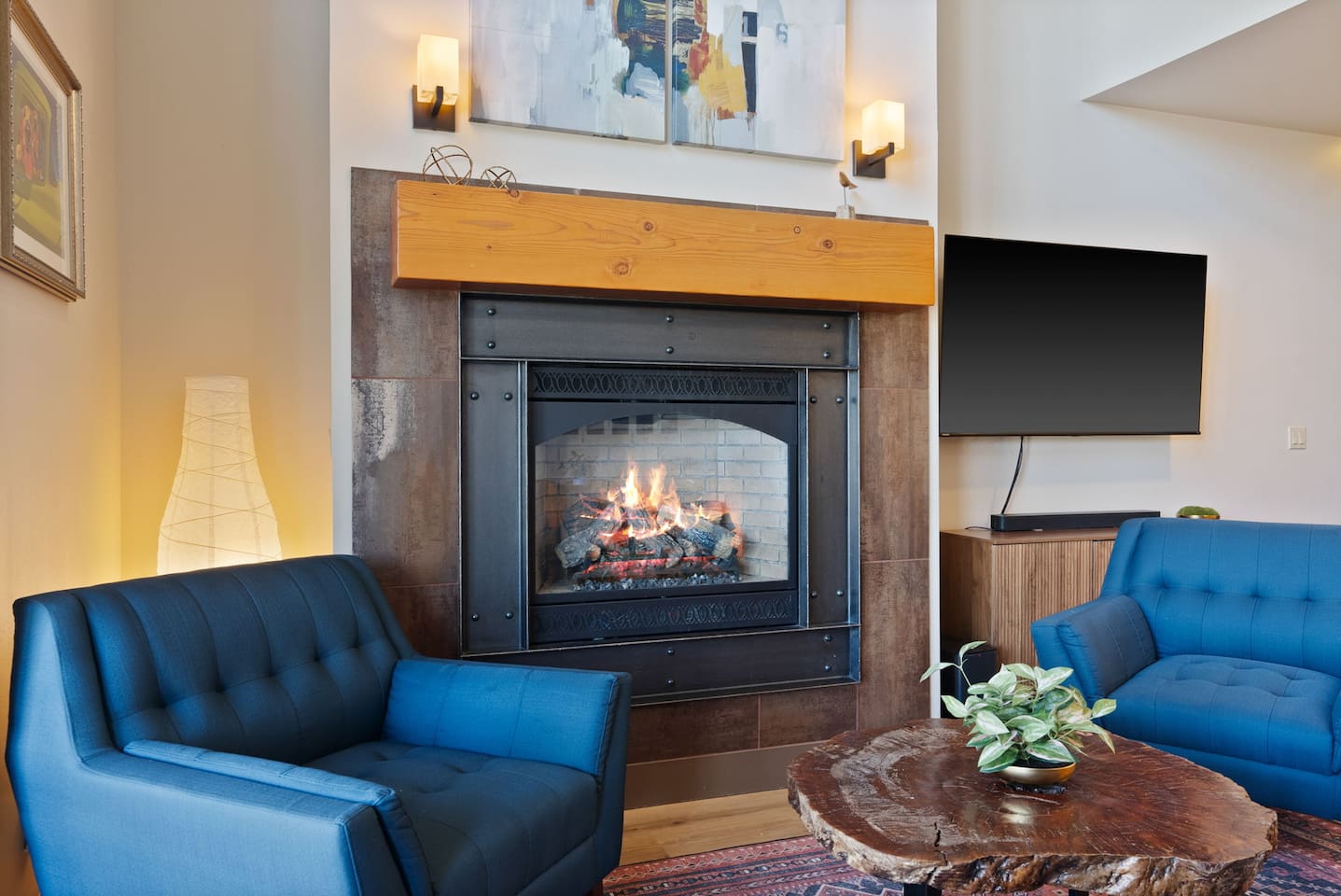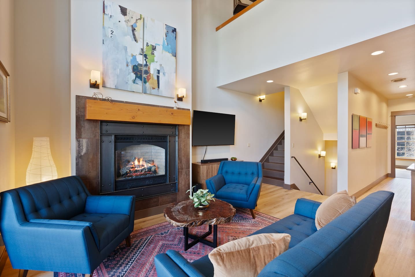 - Living Room: Spacious open-concept living area with Roku TV (access to apps and DirecTV), gas fireplace, stylish sofa seating for 4-6, and fast and free 1G wifi internet