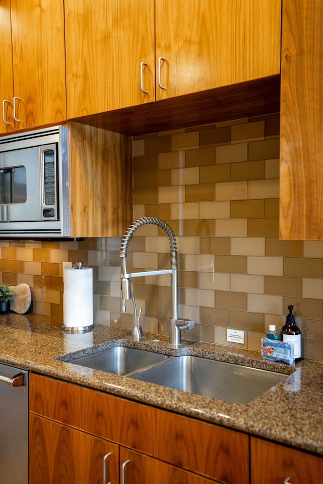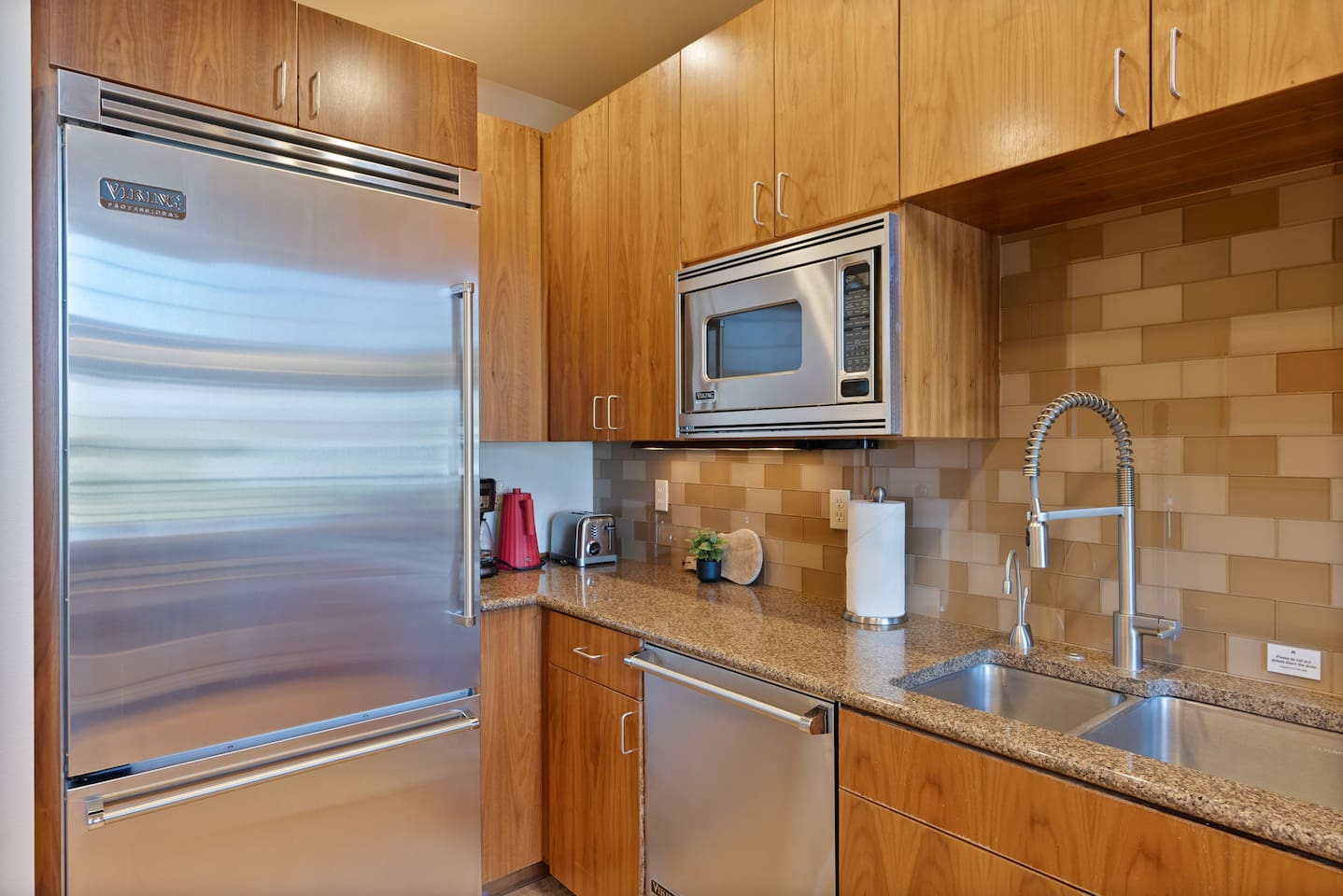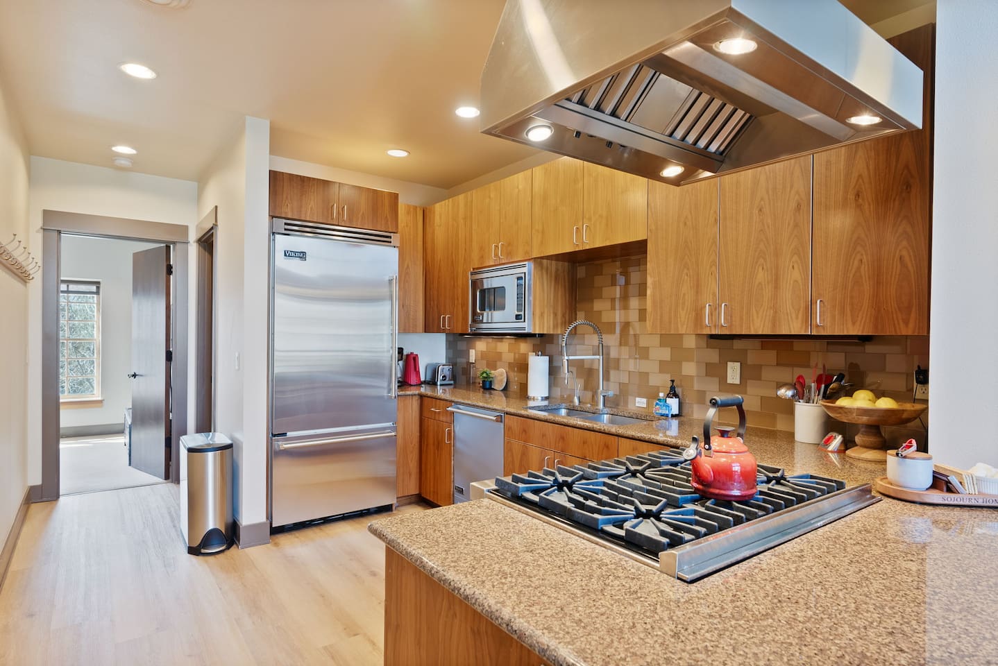 - Kitchen: Full kitchen with high quality Viking appliances. Fully stocked with all kitchenwares for preparing and serving meals. Small appliances like a drip coffee machine, blender, toaster, food processor, rice maker, kettle, and crockpot. Soaps and detergents stocked. Salt, pepper, oil, and some basic spices provided along with a s’more kit to kick off your stay!