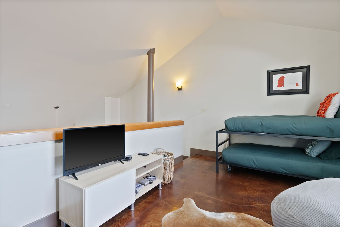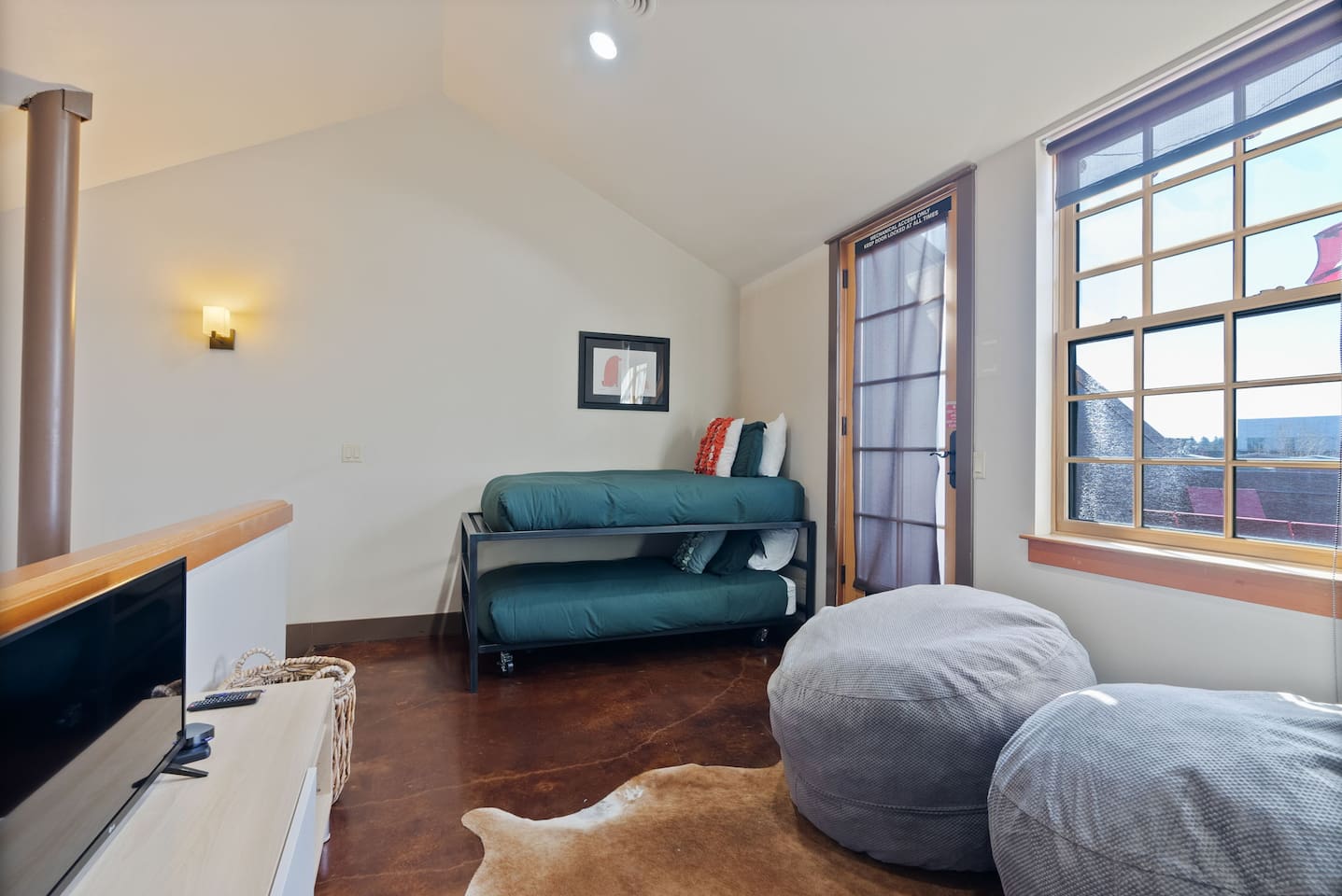 - Bedroom 3: A spiral staircase leads to the third bedroom, an open loft-style bunk room with 4 twin beds. Fun video gaming access via Roku TV on the Super Nintendo and Classic Nintendo NES systems.