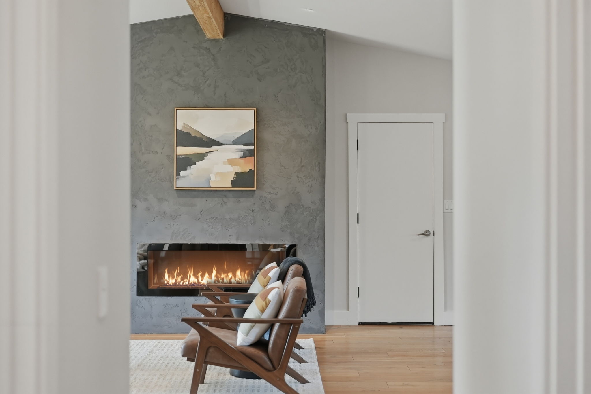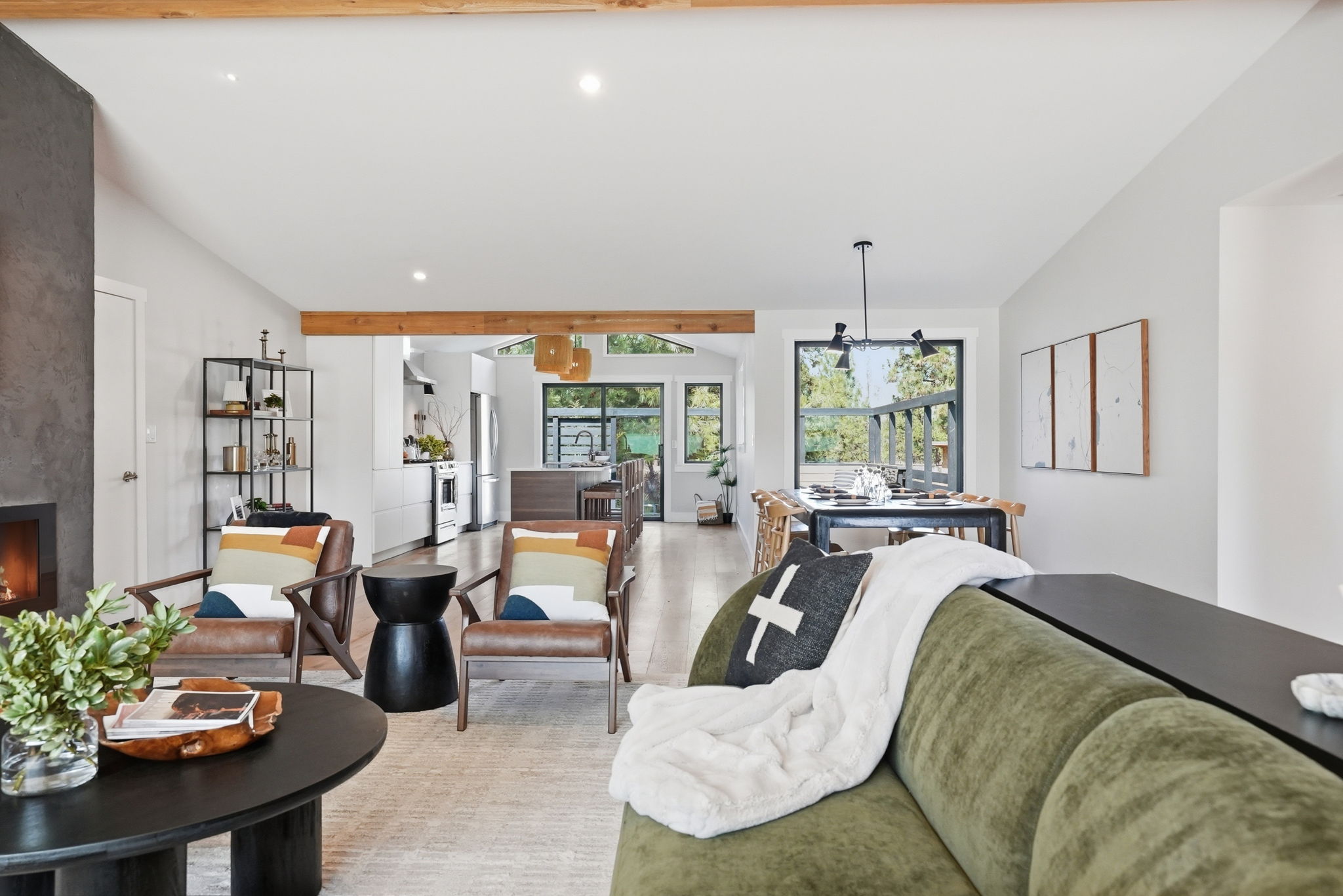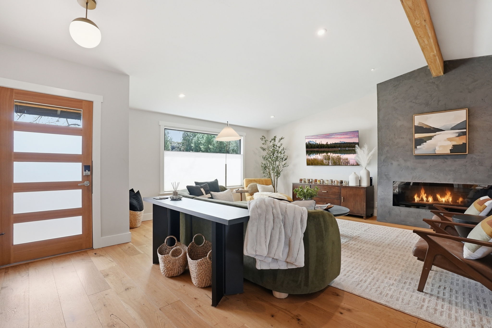 A modern, hand-troweled fireplace anchors the living space, and tasteful modern furniture from West Elm and All Modern is perfect for lounging after a day of adventure.