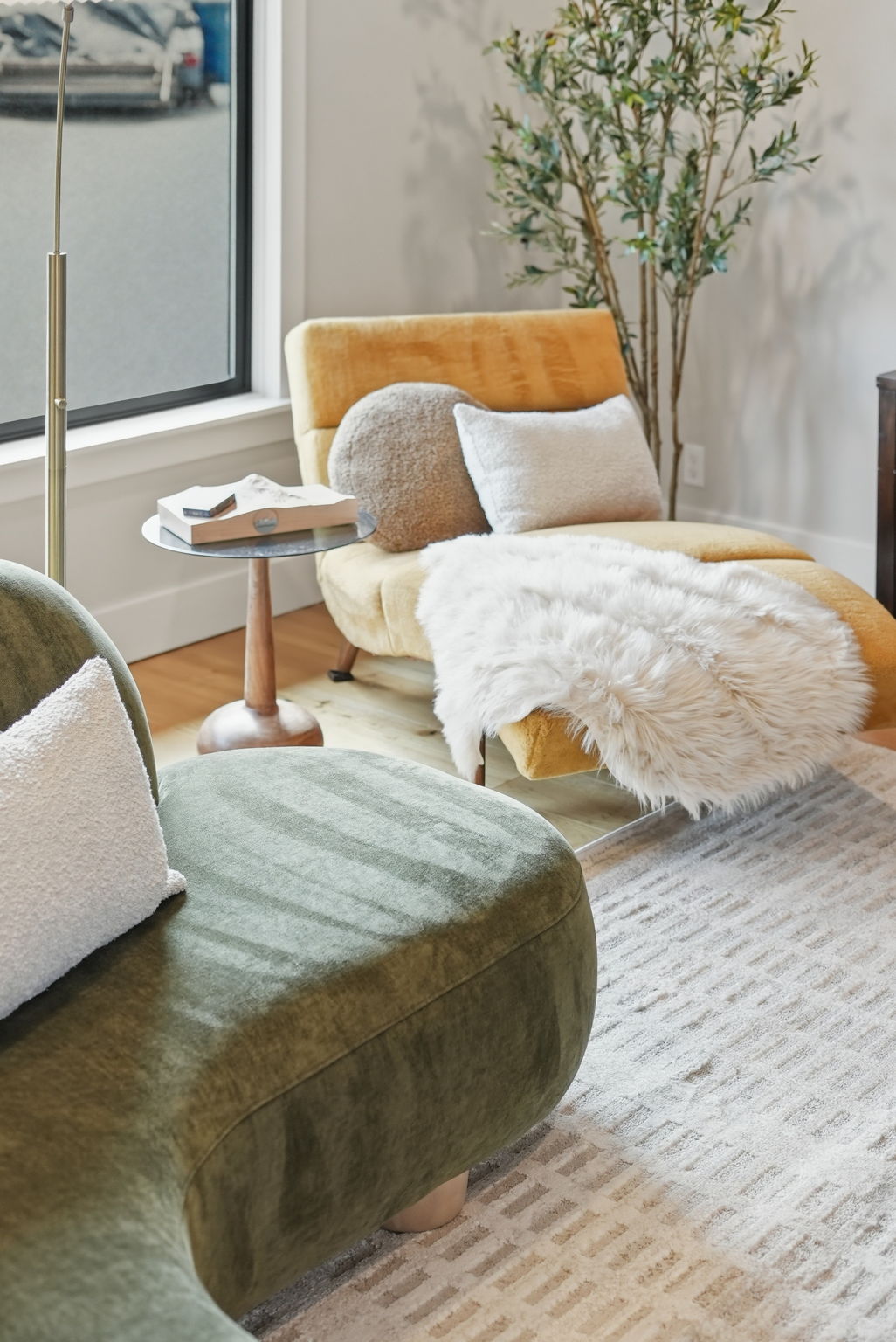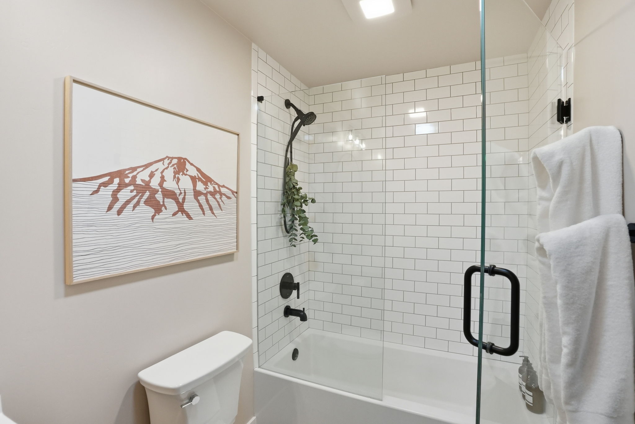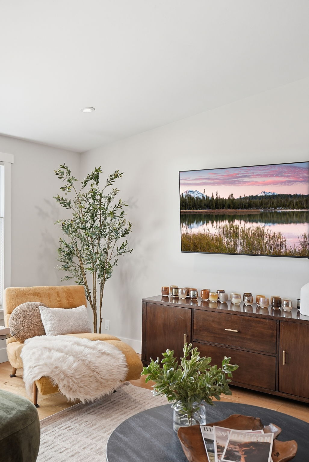 A modern, hand-troweled fireplace anchors the living space, and tasteful modern furniture from West Elm and All Modern is perfect for lounging after a day of adventure.