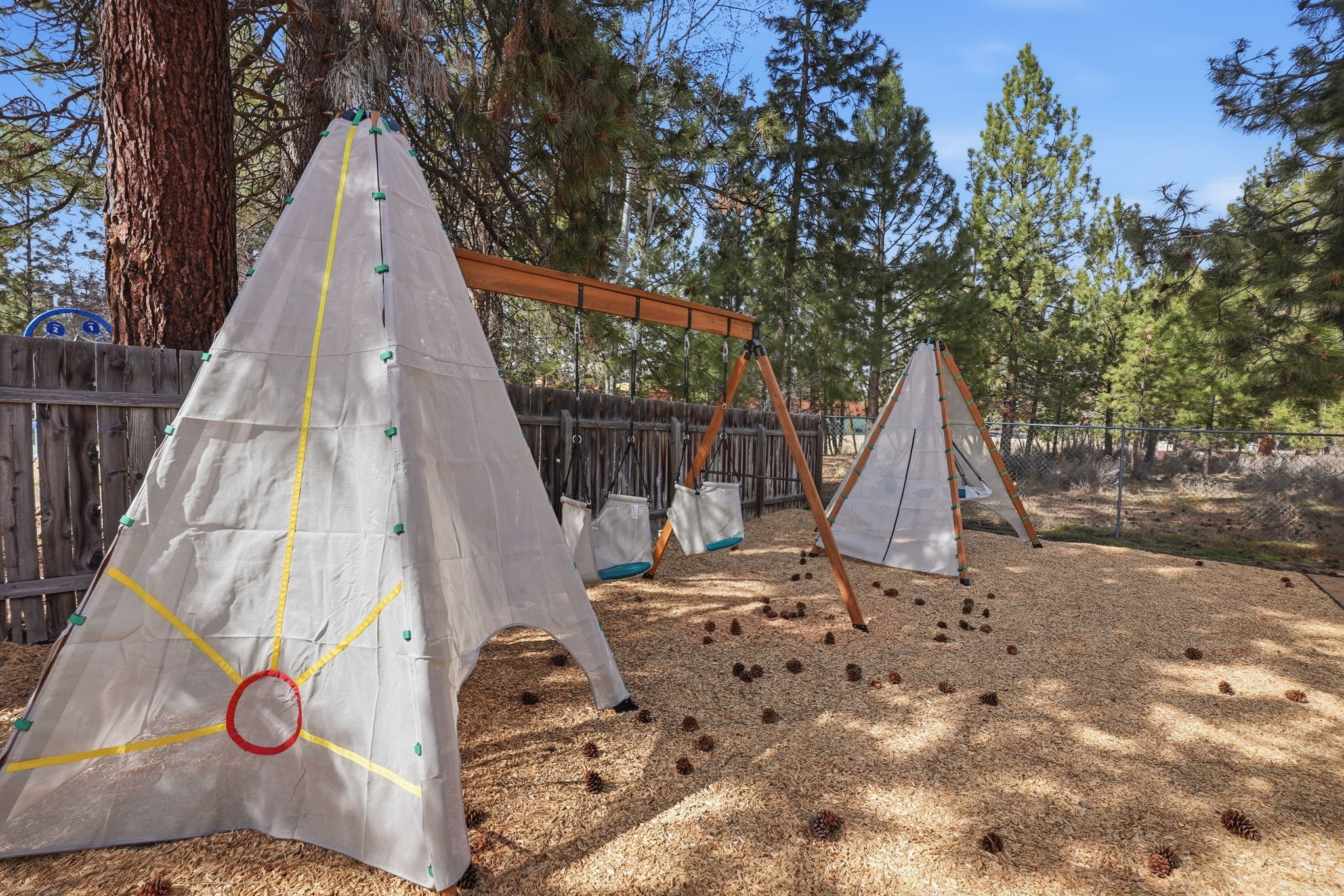 Private backyard with playset & playhouse for safe outdoor play