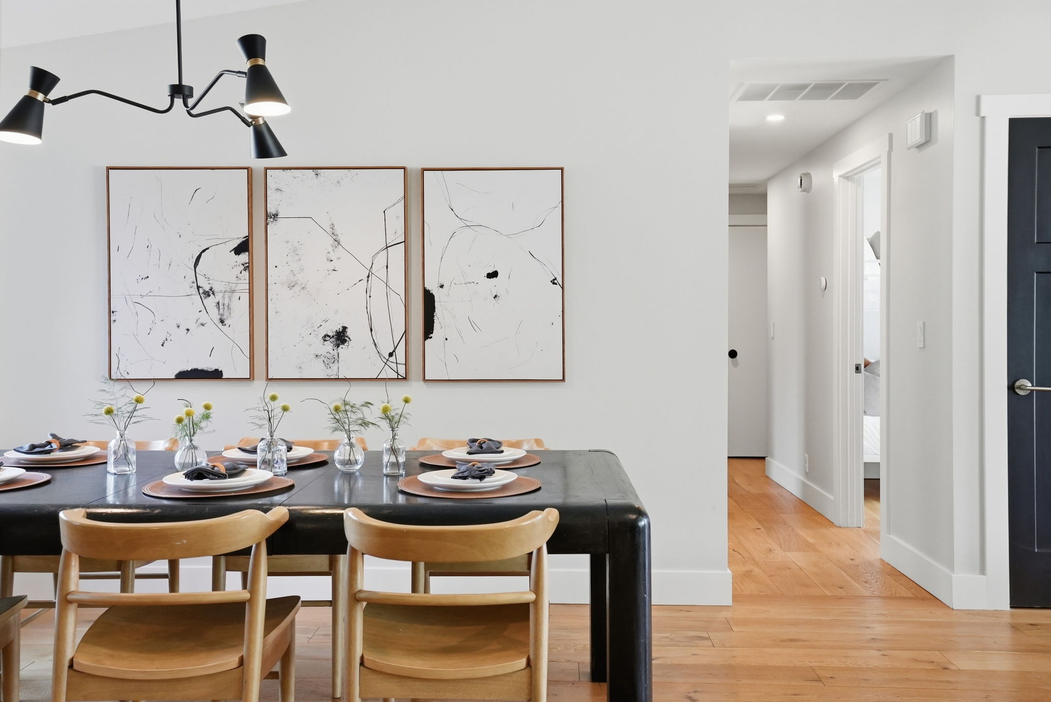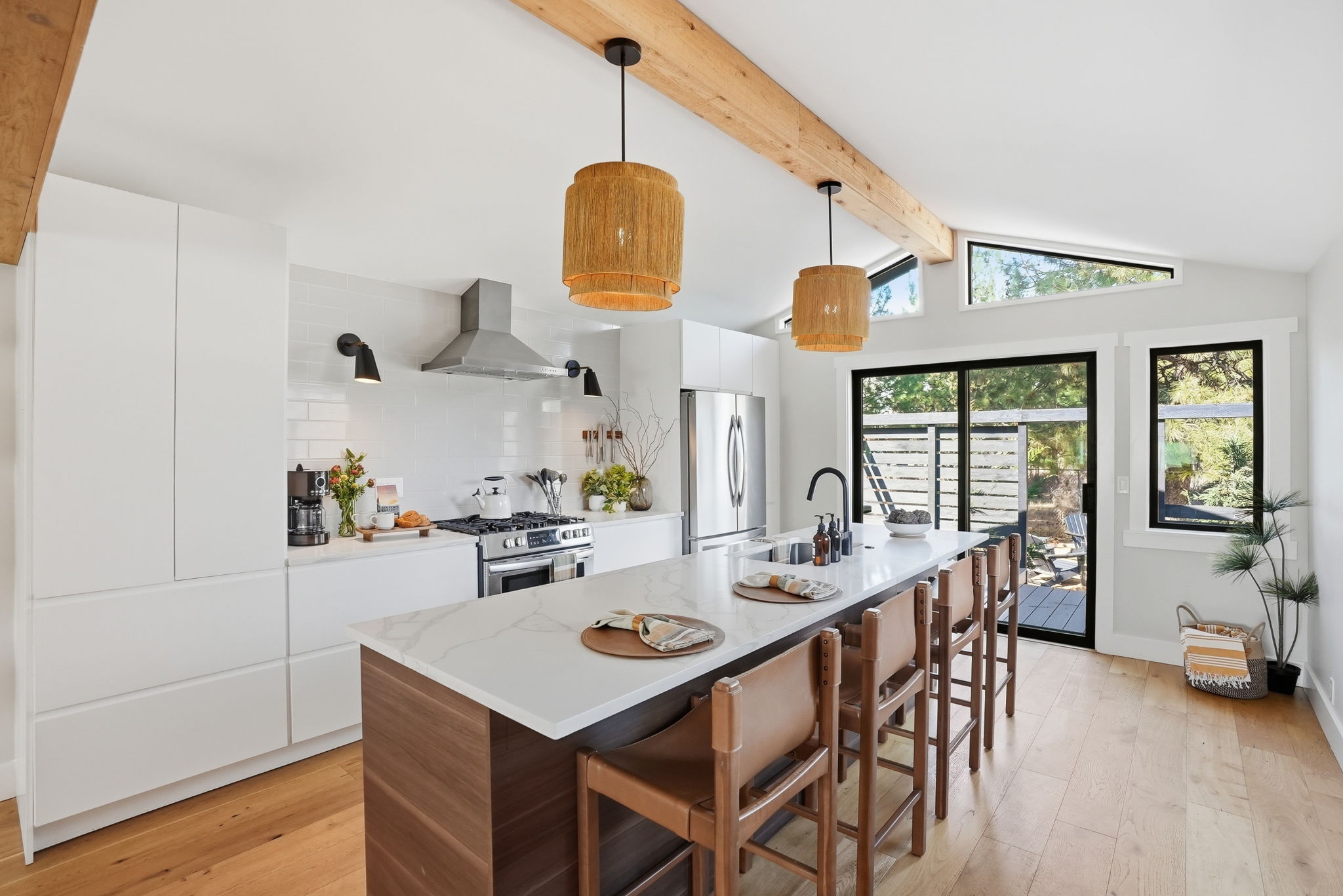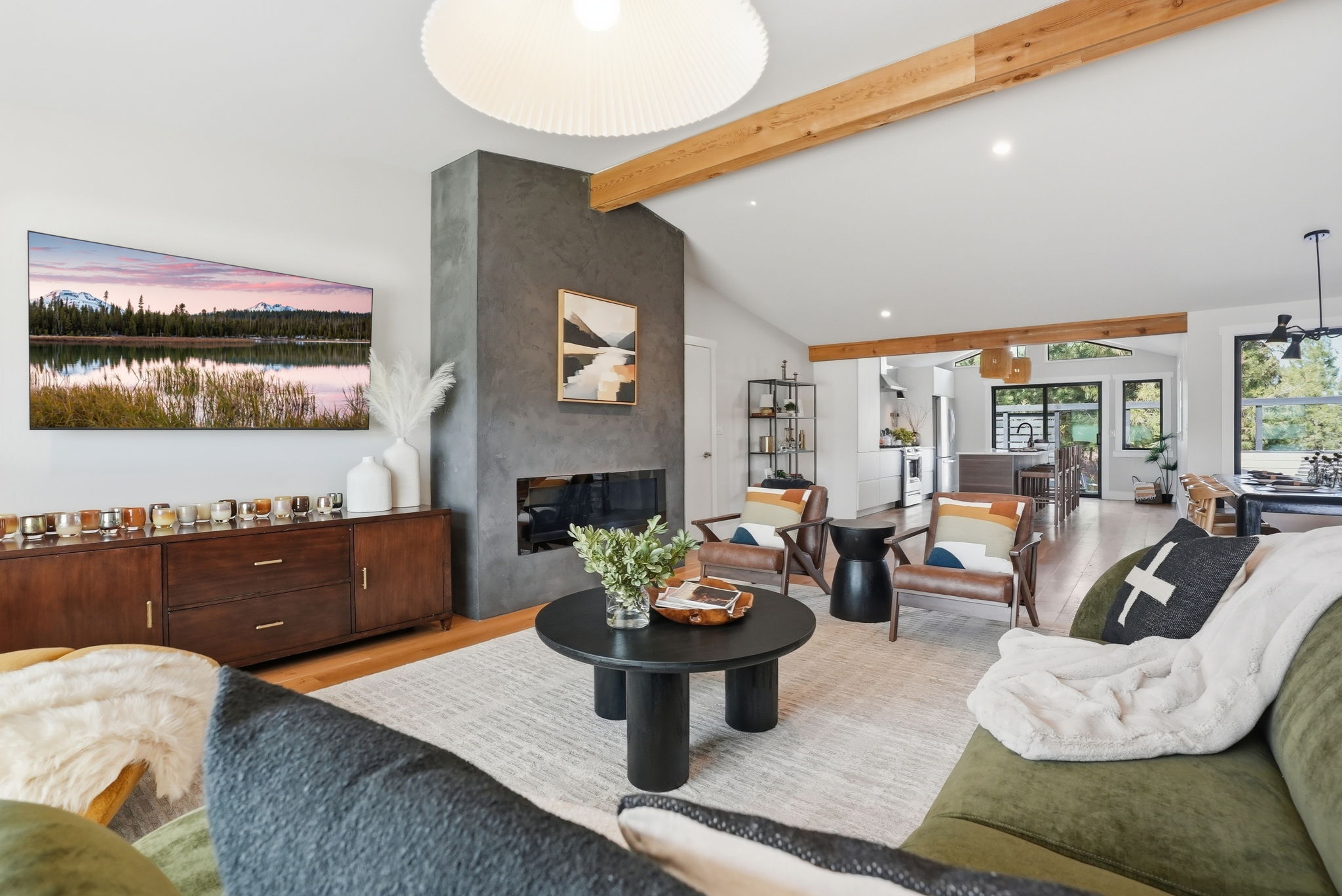 Inside, this stylish Bend vacation home is equal parts chic and functional — every detail dialed in for comfort without sacrificing that cool mid-century character. The open-concept great room flows between living, dining, and kitchen without walls to interrupt the conversation.