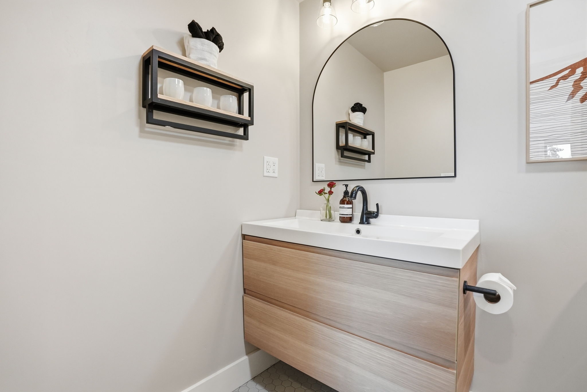 ~Bathroom 2 (Hallway): Tub/shower combo with a custom glass panel, floating sink vanity — polished, stylish, and built to handle a crowd.