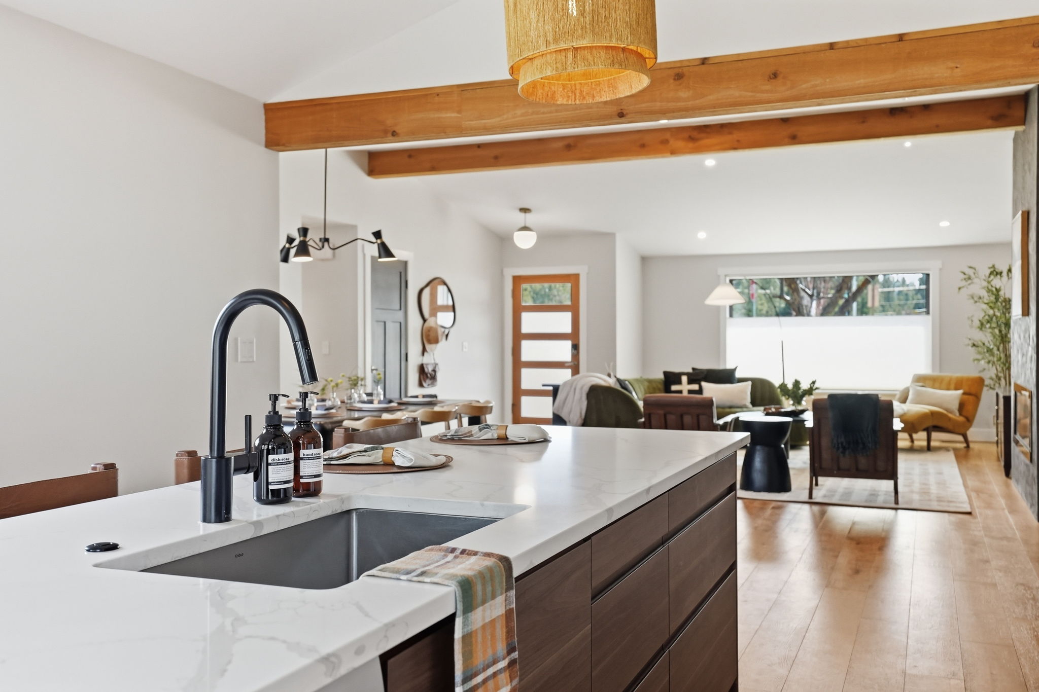 The showstopper designer kitchen features quartz countertops, a large central island perfect for gathering around, and views straight through to the backyard. It's the kind of kitchen that’s made for whipping up a big family breakfast or apres ski snacks.