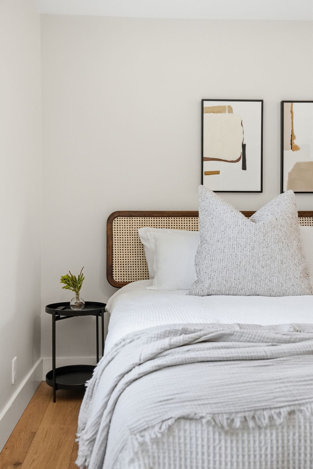 ~Bedroom 1 — Primary Suite: A king bed, flat-screen TV, built-in closet, and private views to the backyard. The ensuite bathroom features a walk-in shower with custom glass panel, a sleek floating sink vanity, and spa-adjacent finishes that make morning routines feel indulgent.